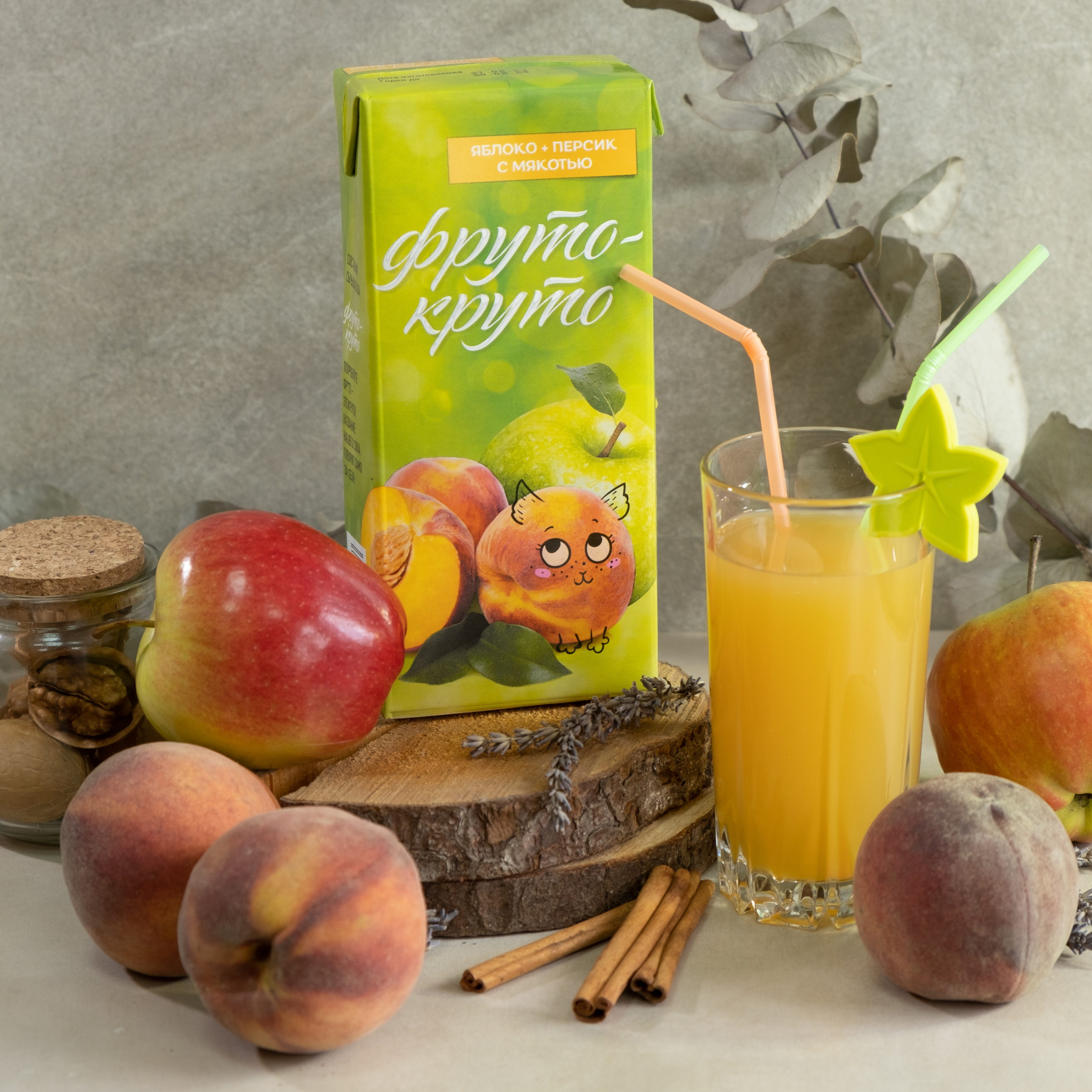 Apple-peach nectar with pulp for baby food for preschool and school-age children, sterilized, homogenized, aseptically packaged.