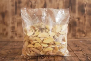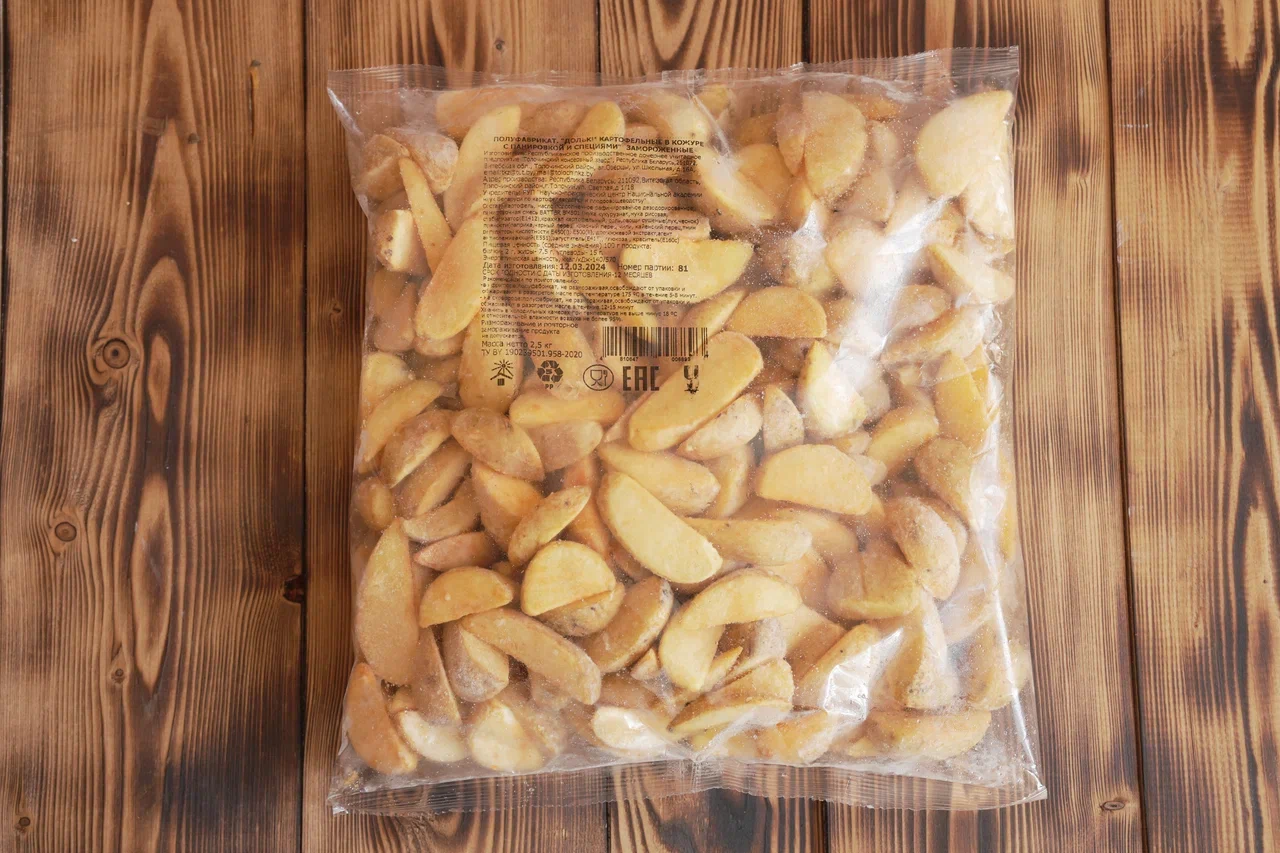 Semi-finished product. Potato wedges in their skins, breaded, and seasoned.